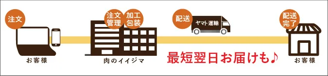 当店では、お肉を成型・加工する肉匠と、包装・梱包をする包装スタッフ、そして受注を行う受注スタッフの3グループにて 肉のイイジマ通販を運営。すべてのチームが同じビル内にあるため、 ご注文の対応がリアルタイムで行われ、スピード出荷が実現。 造り立てのお肉が翌日お届けすることを可能としております。また、急な変更なども臨機応変に対応しており、 お客様のお声などでも好評をいただいております。
