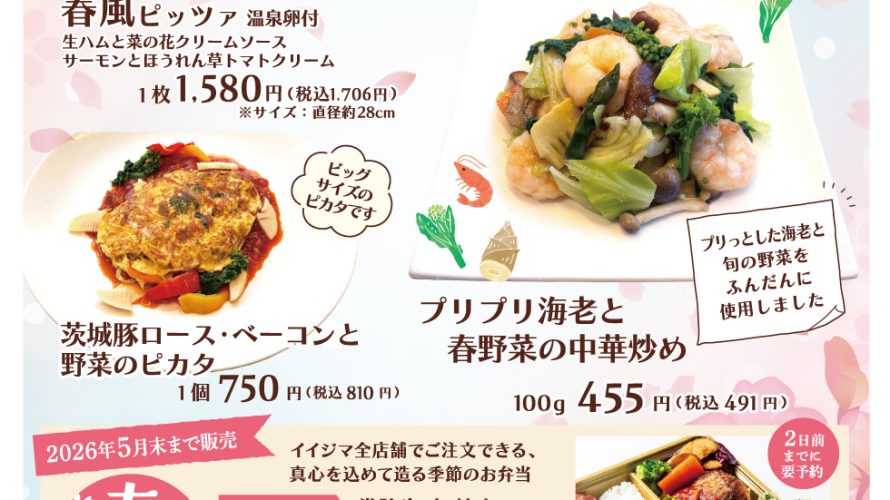 春のお祝いフェア 第2弾 開催! 春の訪れを感じる特別メニューが登場。 旬の食材をふんだんに使用した、華やかな料理をお楽しみいただけます。 開催期間:2026年4月3日(金)〜4月5日(日) 🌸 春風ピッツァ 温泉卵付 春の味覚を一枚に詰め込んだ贅沢ピッツァ。 生ハムと菜の花のクリームソースに、サーモンとほうれん草のトマトクリームを合わせた、春らしい彩り豊かな一品です。 価格:1, […]