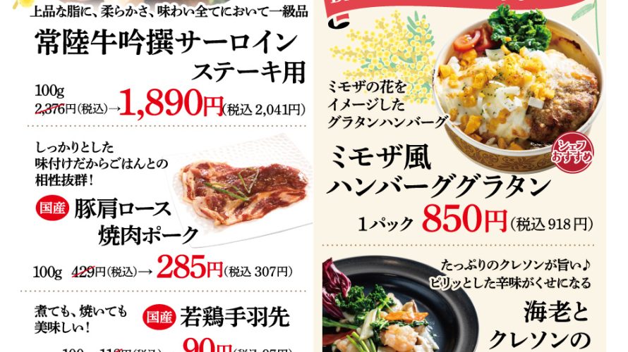 春のごちそうフェア開催 春の味覚を楽しめる特別フェア 「春のごちそうフェア」を開催いたします。 ■ フェア期間 2026年3月13日(金)〜3月15日(日) ■ DELI-I フェア期間中のおすすめ品 ミモザ風ハンバーググラタン ミモザの花をイメージした彩り豊かなグラタンハンバーグ。 チーズのコクとハンバーグの旨味が楽しめる人気メニューです。 1パック 850円(税込918円) 海老とクレソンの旨 […]