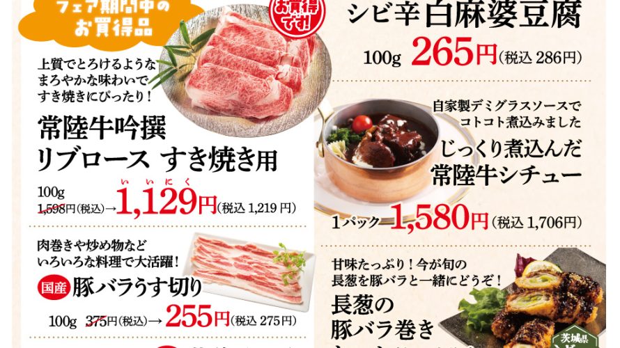 あったか鍋&煮込みフェア開催(1/23〜1/25) 寒い季節にぴったりの「あったか鍋&煮込みフェア」を開催します。 常陸牛を使った鍋・煮込み惣菜と、お買得精肉商品で冬の食卓をあたたかく応援します。 ■ フェア期間 2026年1月23日(金)〜1月25日(日) ■ シェフおすすめ あったか惣菜 シビ辛白麻婆豆腐 四川山椒が効いた青大豆入りの、さっぱり塩マーボー。 サッパリしつつもシビれる辛さで、体の […]