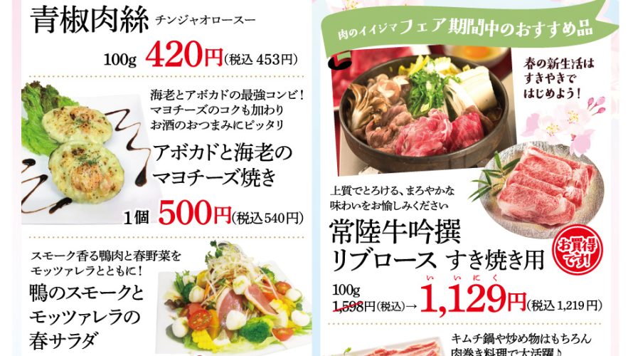 春爛漫フェア開催 春の食材が美味しいこの季節、 「春爛漫フェア」を開催いたします。 開催期間:2026年4月17日(金)〜19日(日) 惣菜・精肉ともに、お得で美味しい商品を多数ご用意しました。 シェフおすすめの春惣菜 青椒肉絲(チンジャオロース) 茨城県産の瑞々しい春ピーマンを使用。 柔らかく仕上げたお肉との相性も抜群で、ご飯が進む一品です。 100g 420円(税込453円) アボカドと海老の […]