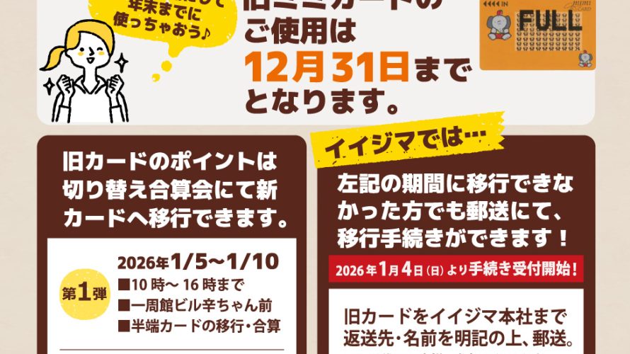 【重要】2026年1月1日より新 mimiカードへ切り替わります いつもイイジマグループをご利用いただき誠にありがとうございます。 お客様にご利用いただいている mimiカードは、2026年1月1日より新カードへ切り替わります。 旧カードのご使用は、2025年12月31日までとなります。 お早めの満点利用・ポイント移行をお願いいたします。 旧カードのポイントは、新カードへ移行できます 旧カードをお […]