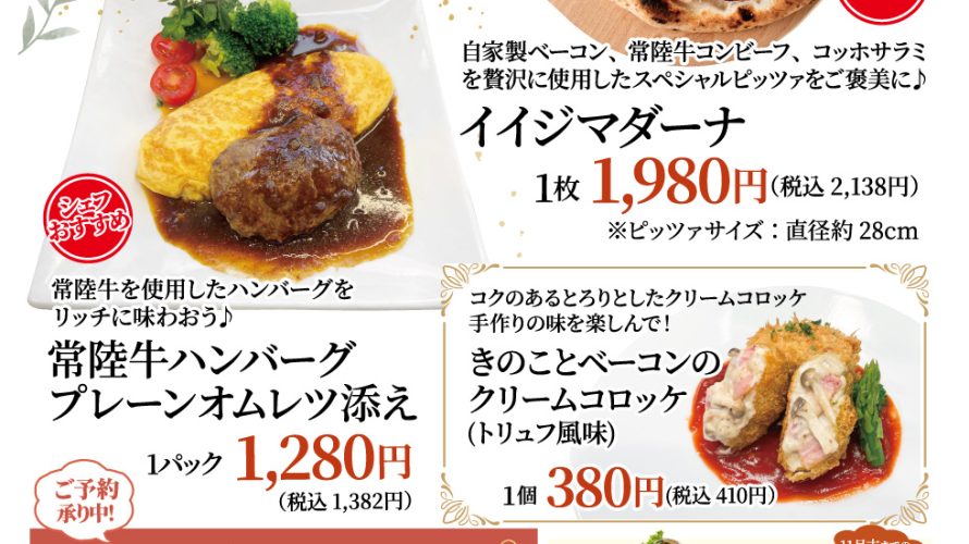 【11/22(土)〜24(月・祝) 開催】So-zai イイジマ『美味しいごほうびフェア』 日頃がんばる自分への“ごほうび”にぴったりな、特別フェアを開催します。 常陸牛を使った贅沢ハンバーグ、人気のスペシャルピッツァ「イイジマダーナ」、そして秋の味覚を楽しめるクリームコロッケまで、どれも期間限定でご用意しました。 フェア限定メニュー 🍽 常陸牛ハンバーグ プレーンオムレツ添え1, […]