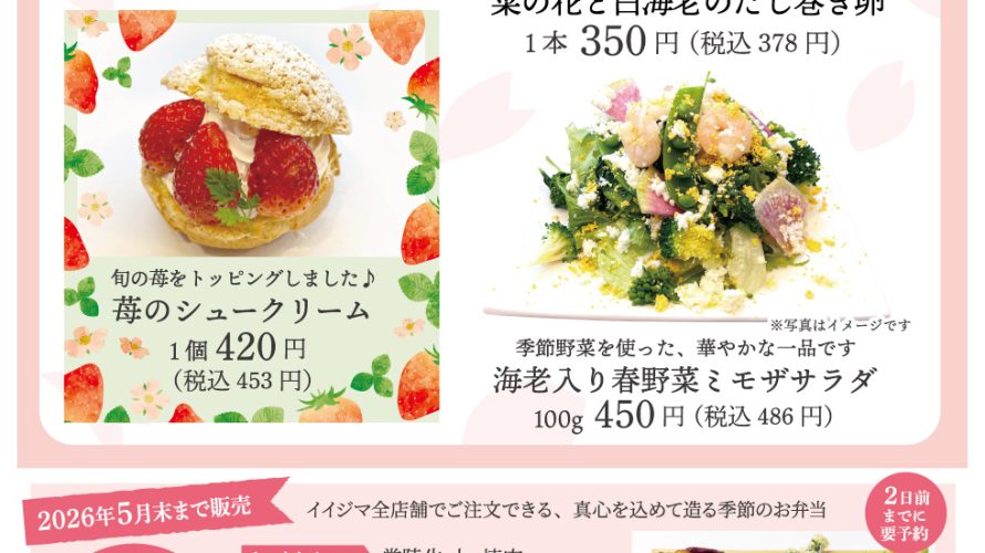 春のお彼岸フェア開催 So-zai iijimaでは、お彼岸のご家族のお集まりやお食事にぴったりの 「春のお彼岸フェア」を開催いたします。 ■ フェア期間 2026年3月20日(金・祝)〜3月22日(日) ■ シェフおすすめメニュー アサリと生姜の中華粥 心と体に優しい味わいの中華粥。 アサリの旨味と生姜の風味が体をやさしく温めてくれます。 1パック 430円(税込464円) 合挽ハンバーグとエビ […]