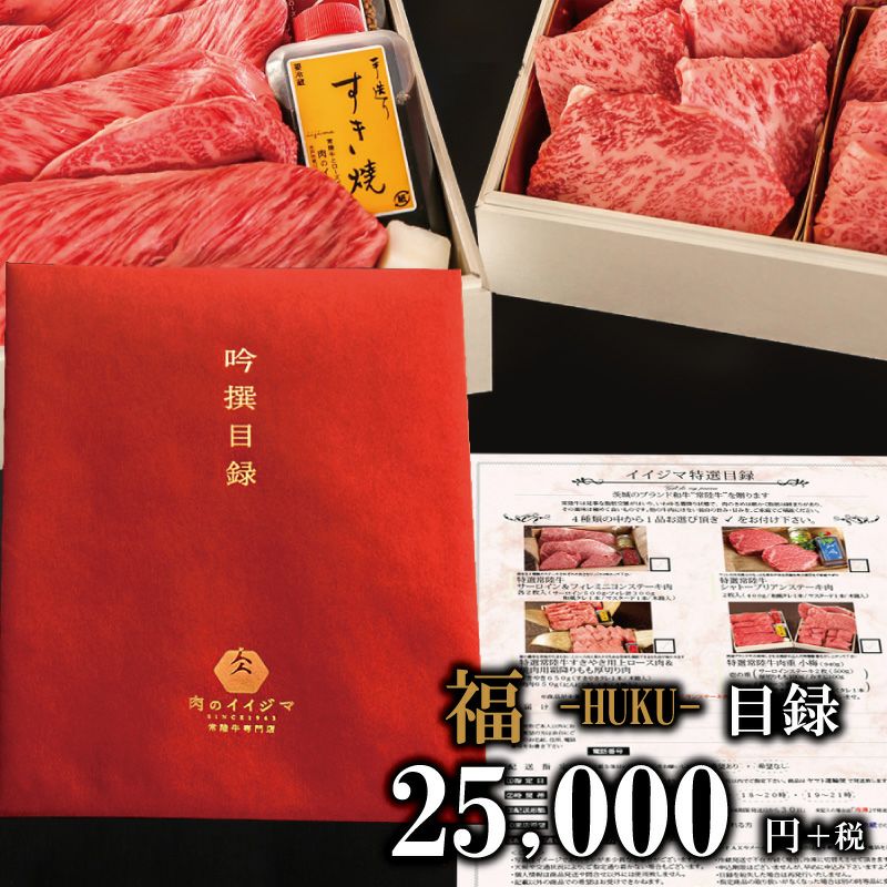 この目録では常陸牛サーロインと常陸牛フィレステーキ、常陸牛シャトーブリアン、常陸牛すきやきリブロースと常陸牛焼肉霜降りもも厚切り、常陸牛肉重 小梅の4種類から選べ、