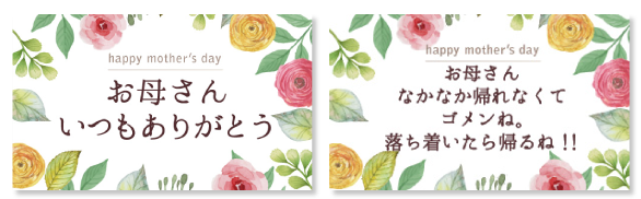 定型文は「お母さん、いつもありがとう」ですが、希望メッセージも承っておりますので